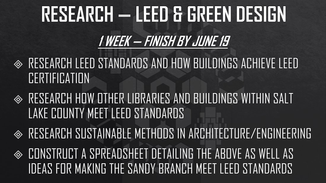 During my time working at the Sandy Library, I learned that the building was scheduled to be remodeled some time in the future. Knowing this, I approached my supervisor and asked to undertake a project to draft a theoretical remodel under the notion that it would be helpful, not only for me, but for her and the library manager as well.