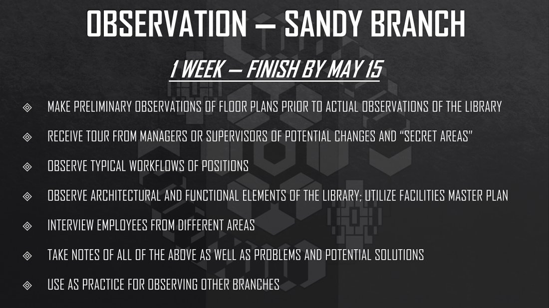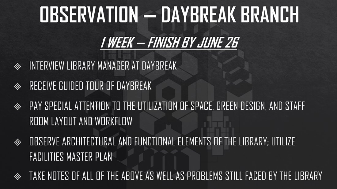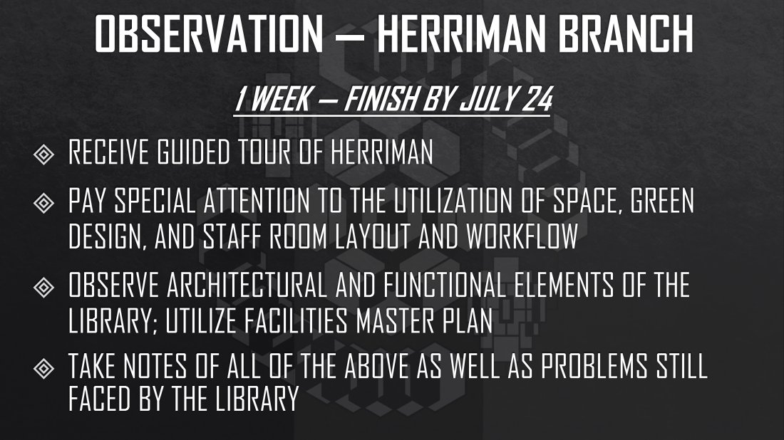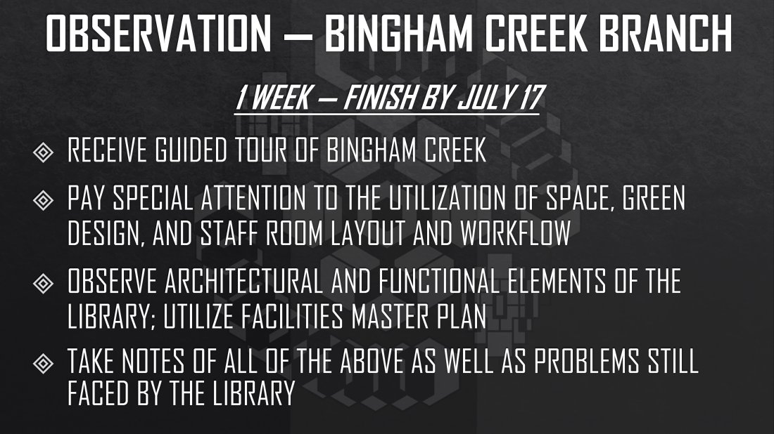 Then, I received guided tours of newer library branches in the system. I took note of my observations and used them to write a second report detailing solutions to the first report.