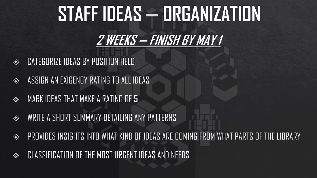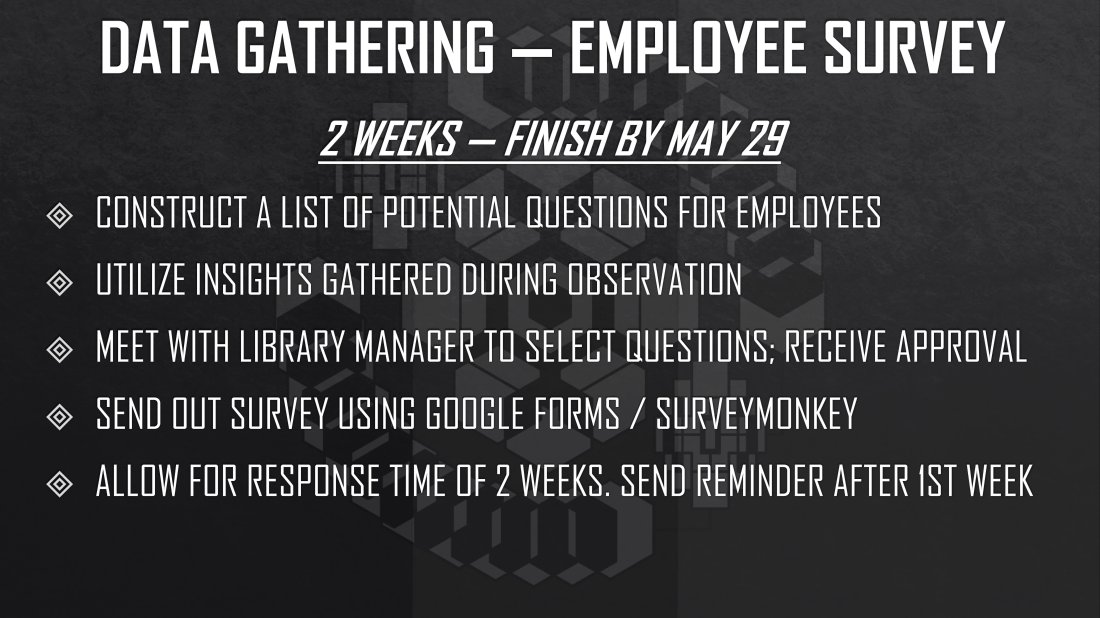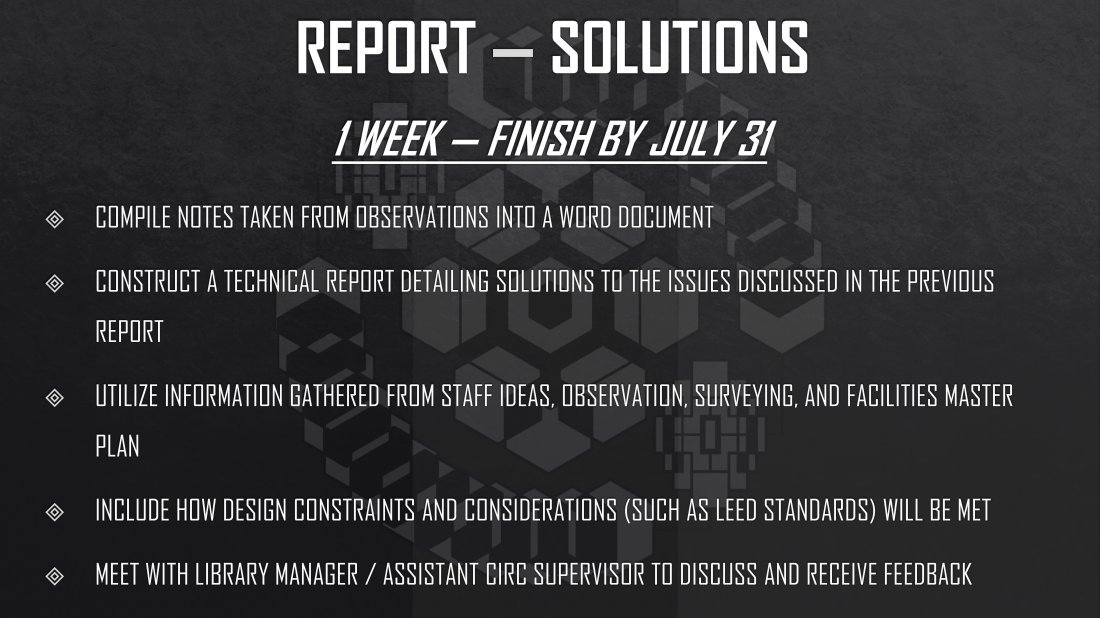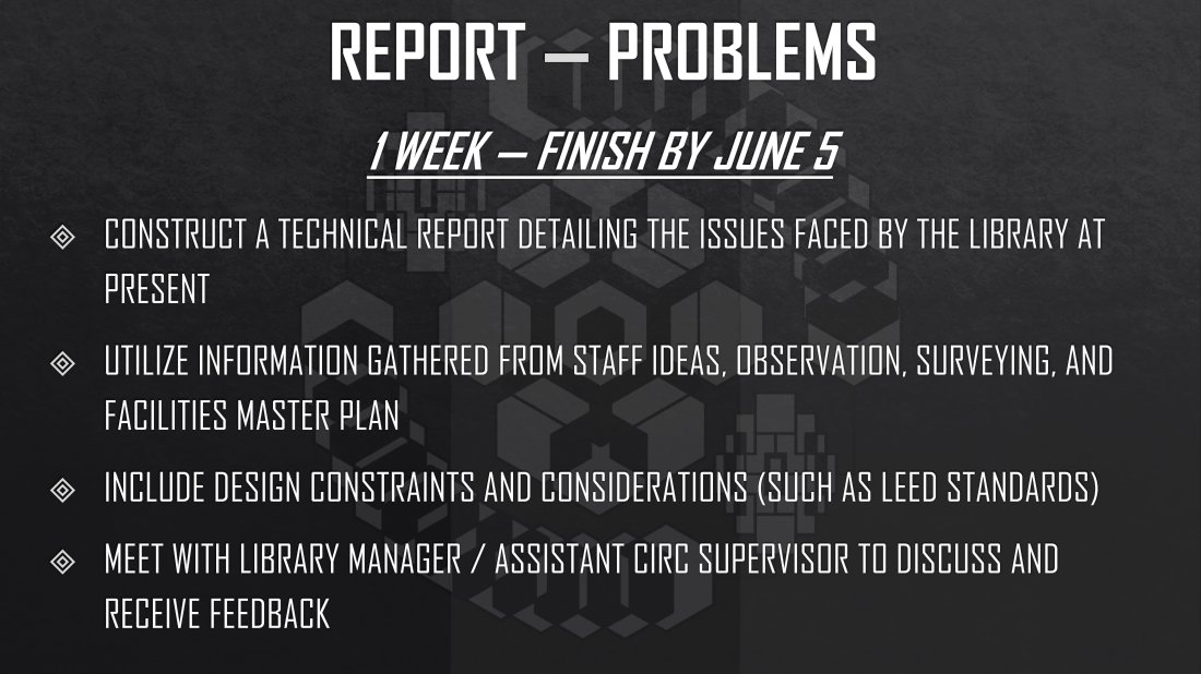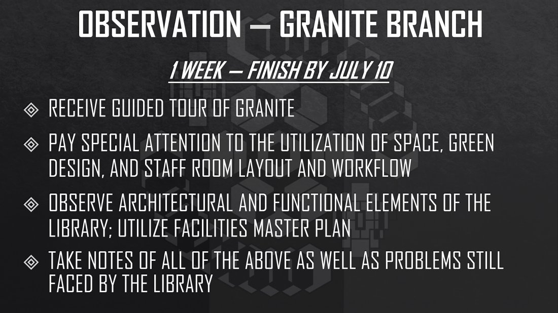 Then, I received guided tours of newer library branches in the system. I took note of my observations and used them to write a second report detailing solutions to the first report.