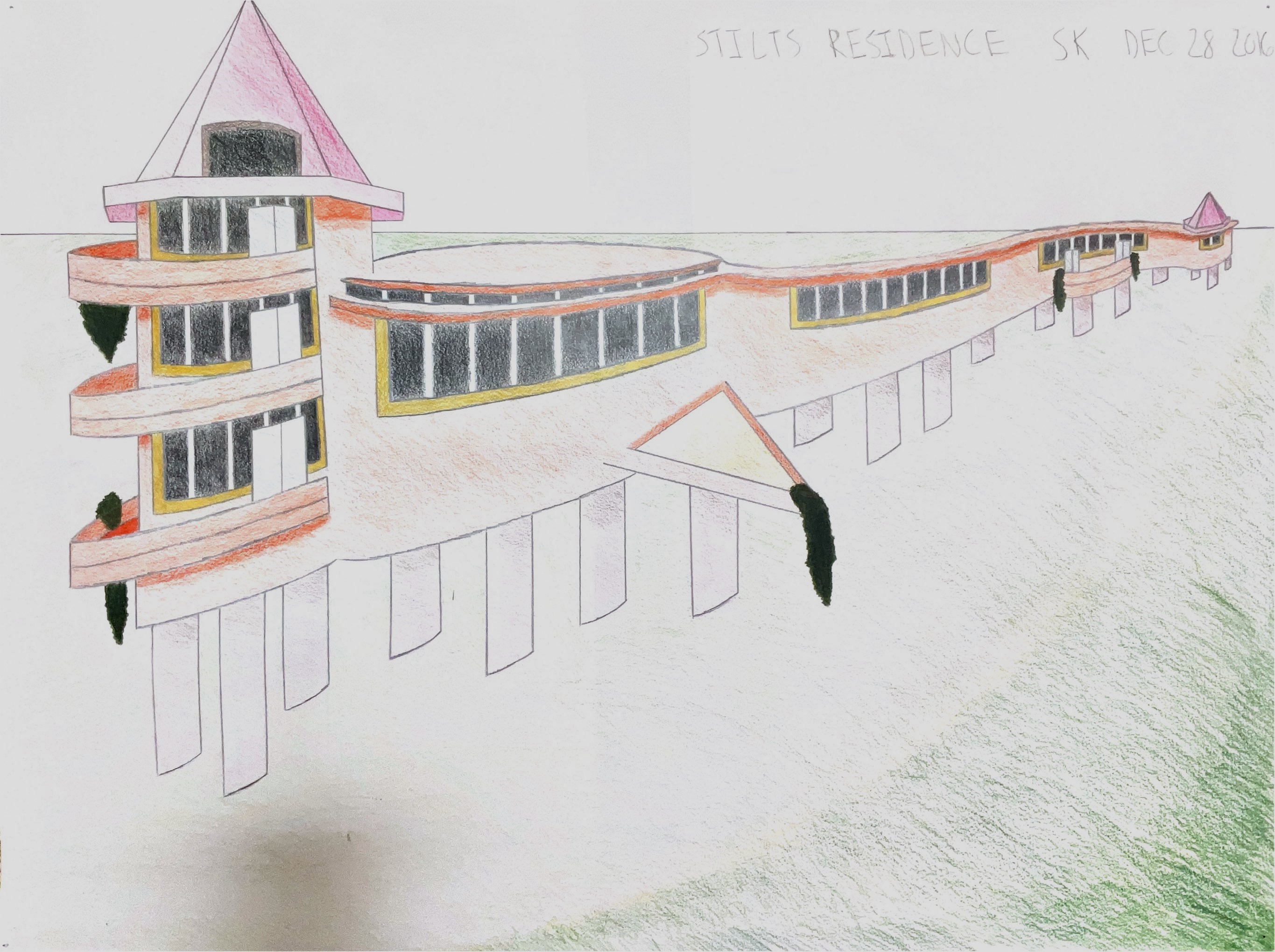 The “Stilts” Residence is the first building that I ever designed. I drew it in 2016, at the age of 13. It is technically an original creation—though heavily influenced by Frank Lloyd Wright and the Ghazni Minarets.