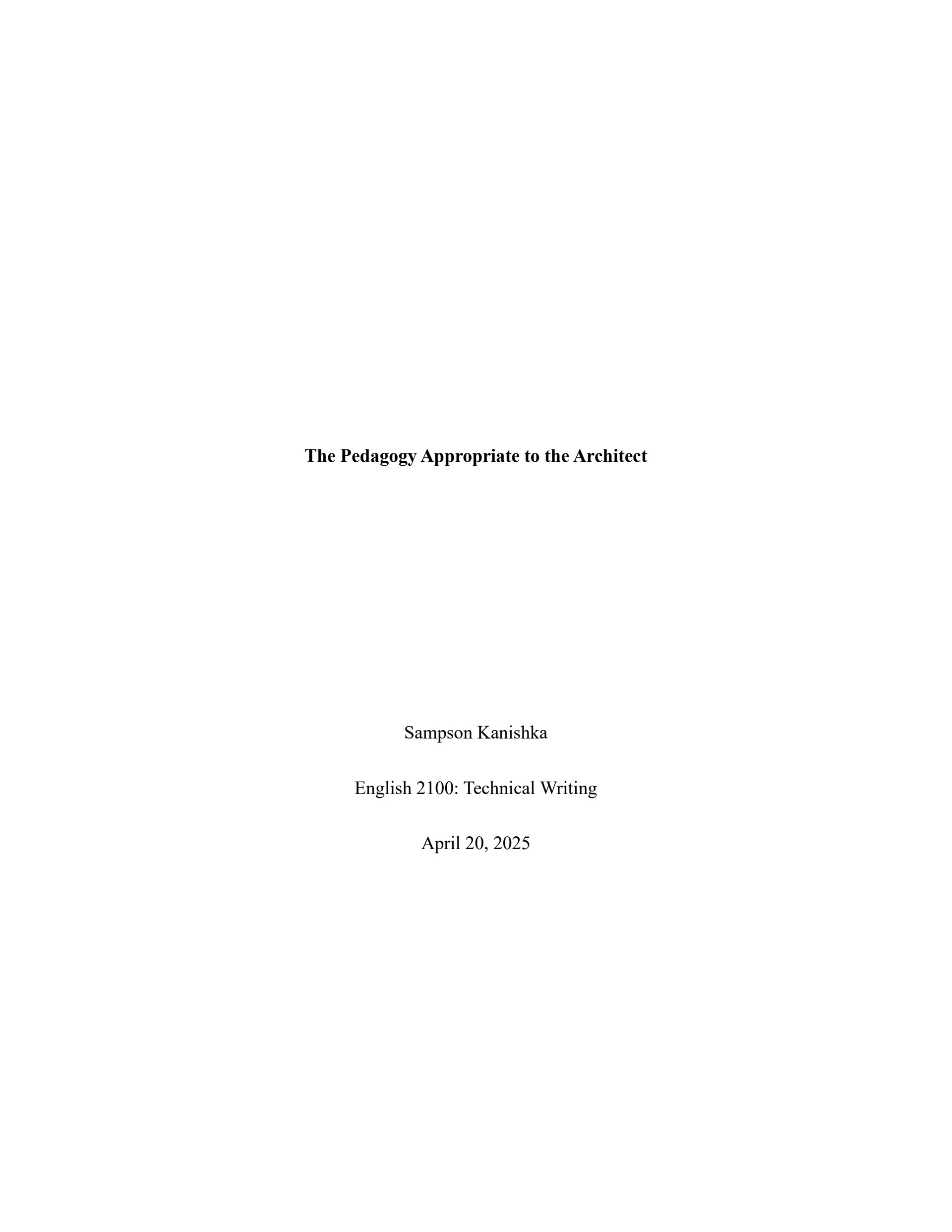 For my writing project, I created a technical report about my career choice—architecture. Specifically, I wrote about the correct education of an architect. I start by showing that a generalist education is more conducive to architecture than a specialist one. Then, I layout how to achieve a generalist education, with detailed examples of various subjects. Throughout the paper, I use my own diverse knowledge, and research from books like Vitruvius' De architectura.