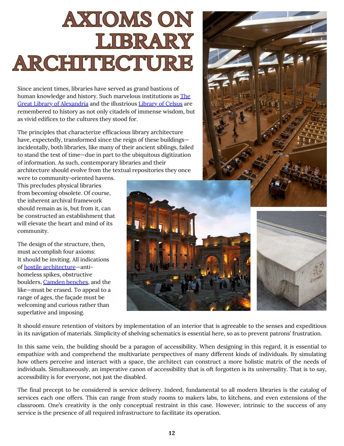 The article briefly explains the four “axioms” of library architecture which I devised to form the basis of my theory pertaining to libraries. These axioms are invitation, retention, accessibility, and service delivery. I explain what each axioms is in detail, and provide examples. By first considering these principles, a more formal design theory of libraries can be invented.