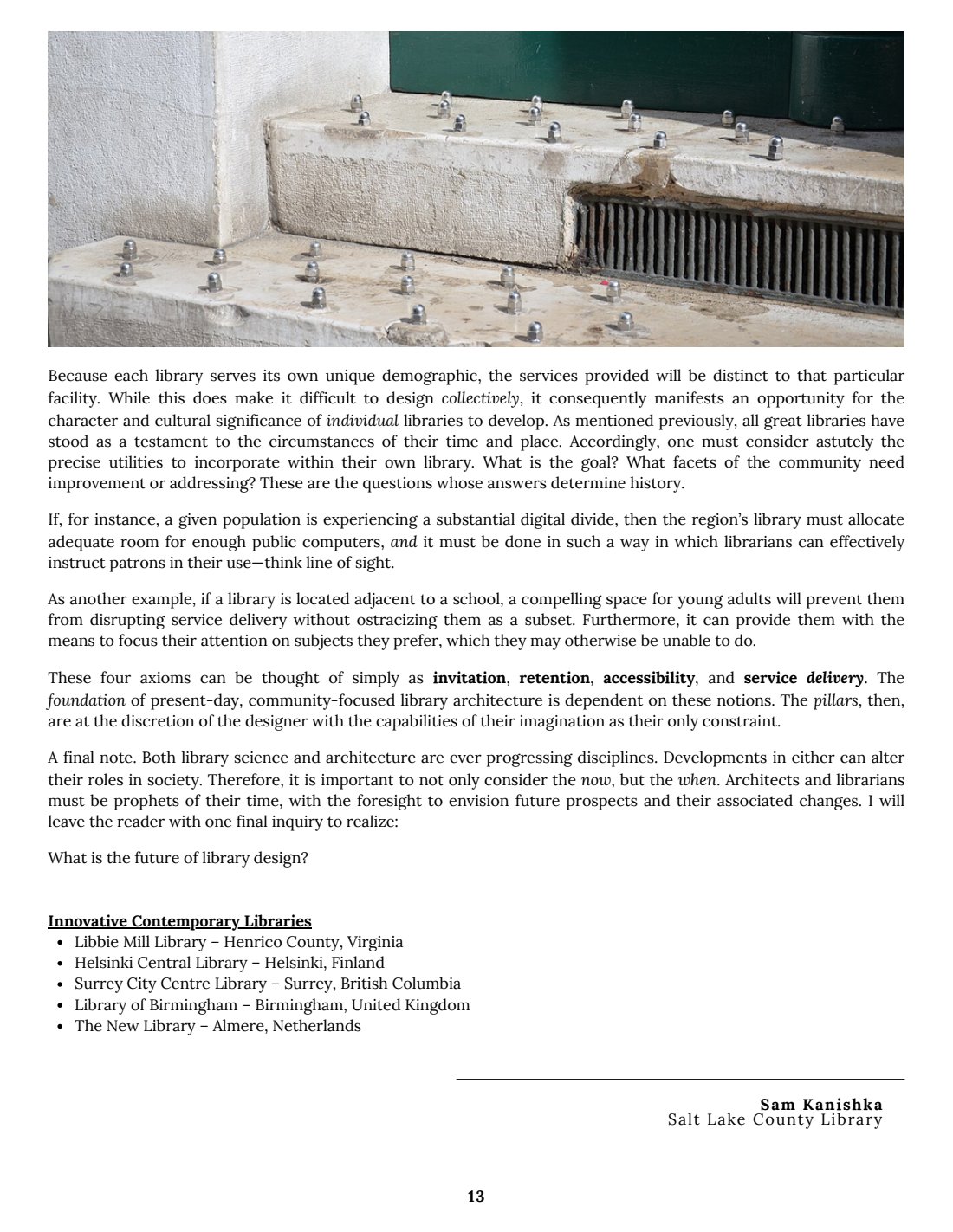 The Utah Library Association (ULA) maintains a quarterly magazine for its members titled Utah Libraries. The periodical includes both information that is pertinent to general library science and specific Utah libraries. I submitted a short article, Axioms On Library Architecture, for consideration which was published in the April 2024 issue.